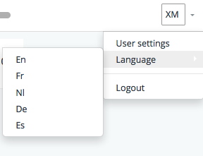 In Myrmex, each user is free to determine the language of its interfaces (and questionnaires when they are translated). To do so, you simply click on you user initials in the top right corner and then decide the language you want to use:
